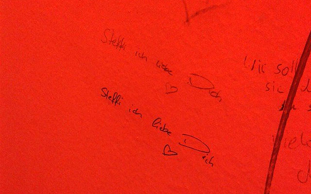 Glücklich: Steffi liebt den Schreiber, er hat es gerade erfahren. Er musste daraufhin dringend aufs Klo, ist total euphorisch, und weil niemand seine Euphorie hört, kritzelt er seine Liebesbotschaft an Steffi an die nächstbeste Wand.